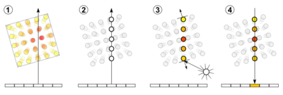 - Compositing. After all sampling points have been shaded, they are composited along the ray of sight, resulting in the final colour value for the pixel that is currently being processed. The composition is derived directly from the rendering equation and is similar to blending acetate sheets on an overhead projector. It may work back-to-front, i.e. computation starts with the sample farthest from the viewer and ends with the one nearest to him. This work flow direction ensures that masked parts of the volume do not affect the resulting pixel. The front-to-back order could be more computationally efficient since, the residual ray energy is getting down while ray travels away from camera; so, the contribution to the rendering integral is diminishing therefore more aggressive speed/quality compromise may be applied (increasing of distances between samples along ray is one of such speed/quality trade-offs).