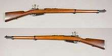 An improved version of the rifle used a coil spring wrapped around the firing pin and a safety and a cocking piece attached to the rear of the firing pin.[10][11] This rifle was shown to the Prussian government, and after some design changes to the safety, was accepted for service as the Infantry Rifle Model 71 on 14 February 1872.[10] Often considered a close relative of the Chassepot rifle, and borrowing Dreyse's turning-bolt action lock, still the most innovative features of the new weapon were the work of Peter Paul Mauser.[12]
