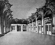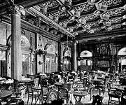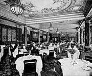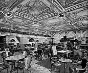 The Empire Room was the largest and most lavishly adorned room in the Waldorf, and soon after opening, it became one of the best restaurants in New York City, rivaling Delmonico's and Sherry's.[69] It was modelled after the grand salon in King Ludwig's palace at Munich, with satin hangings, upholstery and marble pillars, all of pale green, and Crowninshield's frescoes.[70] Empire in style, the Waldorf's restaurant feathered columns of dark-green marble, and the pilasters that came opposite them were of mahogany, with ormolu work in the panels.[32] The caps and bases of both columns and pilasters were gilded. This treatment occupied most of the wall space. The ceiling was divided by heavy beams running from column to column, and between these the flat space was divided into oval and other shaped panels with light mouldings.[32] The color scheme was in tints of pale-green and cream. The panels of the ceiling were frescoed with figures in pinkish-red on a blue sky or field. The walls were principally mahogany and gold, with a little color in the comparatively small wall-spaces left between openings.[71] Among the other rooms were the Turkish smoking room, with low divans and ancient Moorish armor, and the ballroom, in white and gold, with Louis XIV decorations.[63]
