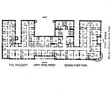 The combined hotel, after merging in 1897, had 1,300 bedrooms and 178 bathrooms, making it the largest hotel in the world at the time.[32][57] With a telephone in every room and first-class room service, the hotel was designed specifically to cater to the needs of the socially prominent, "wealthy, upper crust" of New York, as well as distinguished foreign visitors to the city.[58][59] It was the first hotel to offer complete electricity and private bathrooms, and featured numerous Turkish and Russian baths for the gentlemen of the day to relax in.[55][57] Many of the floors were arranged as separate hotels to further the comfort of the guests. Each of these floors had its own team of assistants—clerks, maids, page boys, waiters—as well as telephone and dumbwaiter service, and refrigerators.[60] The bedrooms and corridors were heated by direct radiation.[32] The family included a stained glass picture of Walldorf in the design of the hotel; it was located on the 33rd Street side over the main entrance to the South Palm Garden.[61]
