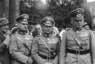 In 1933, Adolf Hitler and the Nazi Party came to power and began to expand the military, in order to realize Hitler's military ambitions.[16] Two years before, Brauchitsch had received his major general promotion. On 1 February 1933, he was named commander of the East Prussian Military District (Wehrkreis I) and Chief of the 1st Division in Königsberg.[17][15] As a consequence of the German re-armament the command position Befehlshaber im Wehrkreis I (Commander of the 1st Military District) was expanded. The staff of the 1st Division formed the staff of the 1st Army Corps and Brauchitsch was appointed its first commanding general on 21 June 1935.[15]