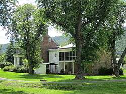 Wappocomo farm is located within the relatively flat floodplain of the South Branch Potomac River valley, to the north of Romney.[54] The farm's property adjoins the Valley View farm and Romney corporate limits to the southwest, the South Branch Potomac River to the west and north, and the South Branch Valley Railroad line and Cumberland Road (West Virginia Route 28) to the east. Mill Creek Mountain, a narrow anticlinal mountain ridge, rises to the west of the opposite riverbank of the South Branch Potomac River, and the western foothills of South Branch Mountain rise to the east.[54][55][56] Mill Creek and South Branch Mountains contain Appalachian-Blue Ridge forests of hardwoods and pine.[57] Hanging Rocks, cliffs of stratified Oriskany sandstone and limestone layers, are located within a gap where the South Branch Potomac River cuts through Mill Creek Mountain approximately 3 miles (4.8 km) north of Wappocomo farm.[58] The unincorporated area at Hanging Rocks is known similarly as Wapocomo (or Wappocomo).[59][60]