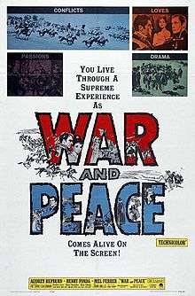 War and Peace is a 1956 American-Italian war drama film directed by King Vidor and written by Vidor, Bridget Boland, Mario Camerini, Ennio De Concini, Gian Gaspare Napolitano, Ivo Perilli, Mario Soldati, and Robert Westerby based on Leo Tolstoy's 1869 novel of the same name. The film, released by Paramount Pictures, was produced by Dino De Laurentiis and Carlo Ponti with a music score by Nino Rota and cinematography by Jack Cardiff.