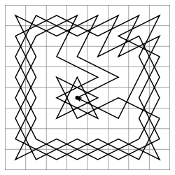 The knight's tour as solved by the Turk, a chess-playing machine hoax. This particular solution is closed (circular), and can thus be completed from any point on the board.