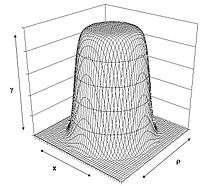 This corresponds to a negative toroidal energy density symmetric to the x-axis. It is notable here, that during a sensitivity analysis for the DARPA-funded 100 Year Starship symposium, Harold White discovered that changing the energy-density distribution from a thin ring as originally proposed to more of a doughnut shape (effectively increasing the warp-bubble wall thickness) can decrease the required total negative energy by several orders of magnitude.