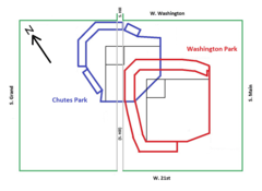 A number of aerial photos of Washington Park exist. Some of them show an H-shaped building on the northwest corner of Main and Washington. That building provides a good landmark to orient the photos with the current street maps.
