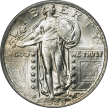 As originally struck, the quarter depicts a head of Washington facing left, with "Liberty" above the head, the date below, and "In God We Trust" in the left field. On the reverse, an eagle with wings outspread perches on a bundle of arrows framed below by two olive branches.[13]