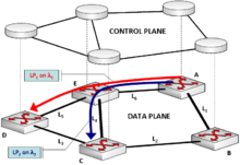 The dynamic provisioning and maintenance of lightpaths is managed by the control plane. The control plane is implemented on a separate network and typically employs one network controller for each node in the data plane, as shown in the figure. The Generalized Multi-Protocol Label Switching (GMPLS) protocol suite, the de facto standard control plane for WSONs proposed by the IETF, is composed of three protocols.[3]