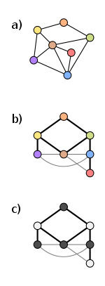 Every graph has a weak 2-coloring. The figure on the right illustrates a simple algorithm for constructing a weak 2-coloring in an arbitrary graph. Part (a) shows the original graph. Part (b) shows a breadth-first search tree of the same graph. Part (c) shows how to color the tree: starting from the root, the layers of the tree are colored alternatingly with colors 1 (dark) and 2 (light).