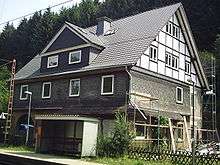 Currently, 97 buildings in Kirchhundem are on the community’s monument list (Denkmalliste), among them the parish churches in the centres of Albaum, Benolpe, Heinsberg, Kirchhundem, Kohlhagen, Oberhundem, Rahrbach and Welschen Ennest as well as the chapels in Brachthausen, Emlinghausen, Kruberg and Selbecke. The private chapel on the Vasbach estate near Kirchhundem is likewise listed. One of the most outstanding monumental building works is the Adolfsburg, a residential castle built in the 1670s, near Oberhundem. Important buildings in the community of Kirchhundem are the art nouveau town hall built between 1903 and 1905 and the many timber-frame houses in the community’s various centres. The Heitmickeviadukt in Kirchhundem, the Kirchhundem-Flape railway station reception building, the aqueduct in the Krenkel Valley near Heinsberg and the portals of the Heinsberger Tunnel are witnesses to the old Altenhundem–Birkelbach Railway, most of which ran through Kirchhundem’s current municipal area. The community’s hallmark is the Rhein-Weser-Turm, an observation tower built in 1932 to afford views of the Rhine-Weser watershed.