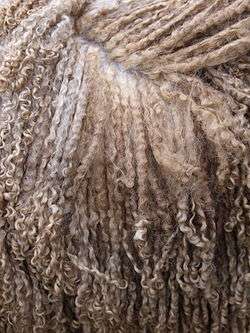 The Wensleydale is a breed of domestic sheep that originated in the Wensleydale region of North Yorkshire, England[1][2] Possessing a blue–grey face, the breed was developed in the 19th century by crossing English Leicester and Teeswater sheep.[2] One of the largest and heaviest of all sheep breeds, the Wensleydale has long, ringlet-like locks of wool. It is categorized as "at risk" by the Rare Breeds Survival Trust of the U.K. as it has fewer than 1500 registered breeding females,[2] it is predominantly used today as a ram breed to cross with other breeds to obtain market lambs and for its high-quality wool.[1][2]
