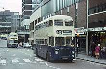 On its formation in 1969 the WMPTE acquired the vehicles and other assets of the municipal bus fleets of Birmingham, Walsall, West Bromwich and Wolverhampton. The former Birmingham City Transport was by far the largest constituent part of the combined fleet, accounting for around two thirds of the new 2100-strong fleet and 8500 employees, and so a modified version of that operator's blue and cream livery was adopted by the WMPTE. The ex-Birmingham assets became 'South Division', with the others forming the Walsall-based 'North Division'. The buses subsequently became known as Wumpty buses by the public, in reference to the WMPTE initials.[6] When the creation of the West Midlands County Council expanded the WMPTE's operating area into Coventry, WMPTE absorbed the vehicles and assets of that city's municipal transport undertaking, Coventry Transport,[7] which became its 'East Division'.