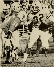 The 1973 and 1974 seasons, however, were not successful campaigns for the Mountaineers, as they finished with lackluster records of 6–5 and 4–7. Despite the disappointment of those seasons, Danny Buggs earned All-American status for his contributions in both campaigns. His 69-yard punt return for a touchdown with 36 seconds remaining to beat Maryland in the 1973 season opener remains one of the greatest moments in Mountaineer history.[34] The 1975 season, however, was successful. The Mountaineers compiled a 9–3 record, a 13–10 Peach Bowl victory over North Carolina State, and a final ranking of No. 17 in the Coaches Poll and #20 in the AP Poll. Additionally, the Mountaineers upset the No. 20 Pitt Panthers 17–14 on a game-winning field goal in the closing seconds in yet another memorable chapter of the Backyard Brawl. Bowden later described the victory as one of the most exciting ones of his coaching career.[31] Following the 1975 season, Bowden left WVU to become the head coach at Florida State, where he would become the second winningest coach in NCAA Division I-A/FBS history. In just six seasons with the Mountaineers, Bowden produced a 42–26 record, good for fifth all-time in the program.[22] Bowden's departure not only signaled the end of his tenure at West Virginia, but to the end of WVU's winning ways in the 1970s.