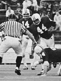 After Lewis's departure, the program hit an all-time low in 1960 under first-year head coach Gene Corum, posting its worst season to date: 0–8–2. The Mountaineers were simply outclassed by their opponents, being outscored 40–259 on the season.[23] The Mountaineers rebounded, however, and by 1962 were back to their winning ways, posting an 8–2 record and 4–0 conference record. Despite their undefeated conference record, once again the SoCon crown eluded the Mountaineers in favor of the VMI Keydets and their 6–0 record in conference play.[24] West Virginia did not have to wait long for its next SoCon title, however, as the program won the title in the 1964 and 1965 seasons consecutively. The Mountaineers finished 7–4 in 1964 and participated in the Liberty Bowl against Utah, West Virginia's first bowl game in 11 years as well as the first major college football bowl game ever played indoors and to be broadcast nationwide in the United States.[25] Corum's tenure ended thereafter, posting a 29–30–2 record over his six seasons as head coach. Corum's legacy went well beyond wins and losses, however, as he integrated WVU football in 1963 with the program's first African-American recruits in Roger Alford and Dick Leftridge.[26]
