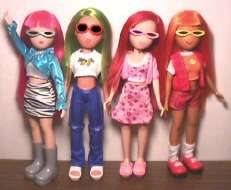 The "What's Her Look" line of 2003 seemed to have experienced a very limited release, and was the last line available in America. Glam, Hip, Sweet and Cool were now known as Wild, Retro, Fresh, and Chic respectively. These Dolls were about an inch taller, and much slimmer than their predecessors, though still with the large flat feet. In addition to their simple outfit and their single, glitter-streaked wig, these dolls also came with a multi-patterned tube of stretchy fabric and a pair of scissors. The tube could be cut and customized into any number of unique clothing items for the doll.