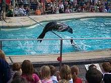 Formerly the zoo's Dolphin Pool, Sea Lion Splash is a daily demonstration in which the zoo's three trained California sea lions (two females named Bailey and Lara, and a male named Dom) perform tricks and stunts in their pool (referred to as the 'Splash Zone').In June 2015, Dom and Bailey gave birth to a male sea lion called Oscar.[11]