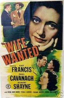 Wife Wanted is a 1946 American crime directed by Phil Karlson, featuring Kay Francis, Paul Cavanagh and Robert Shayne. This was Kay Francis's last film.[1] The film's screenplay was written by Caryl Coleman and Sidney Sutherland, based on the novel Wife Wanted by Robert E. Callahan.[2]