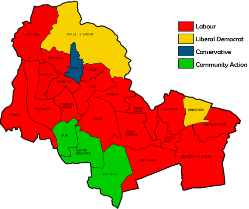 Labour lost five seats on the night, with each of three main competitors picking up seats. Community Action accounted for three, gaining further representation in Bryn and Lightshaw and also making another breakthrough in the formerly uninterrupted Labour territory of Ashton-Golborne. The Lib Dems picked up a seat in the historically competitive Aspull-Standish ward for the first time in over a decade, as well as comfortably defending their seat in Hindsford. The Tories strengthened their footing on the council with another gain in Swinley, a ward which had reliably elected Conservatives throughout the eighties, but had progressively been routed in the early nineties. This left Labour's majority at 58, the lowest in just under twenty years.