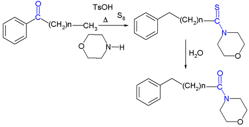 An example with modified reagents (sulfur, concentrated ammonium hydroxide and pyridine) is the conversion of acetophenone to 2-phenylacetamide and phenylacetic acid:[3]