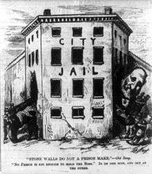 Tweed's first trial, in January 1873, ended when the jury was unable to agree on a verdict. His retrial in November resulted in convictions on 204 of 220 counts, a fine of $12,750[5] (the equivalent of $252,273 today) and a prison sentence of 12 years; a higher court, however, reduced Tweed's sentence to one year.[26] After his release from prison, New York State filed a civil suit against Tweed, attempting to recover $6 million in embezzled funds.[26] Unable to put up the $3 million bail, Tweed was locked up in the Ludlow Street Jail, although he was allowed home visits. On one of these, Tweed escaped and fled to Spain, where he worked as a common seaman on a Spanish ship.[22] The U.S. government discovered his whereabouts and arranged for his arrest once he reached the Spanish border; he was recognized from Nast's political cartoons. He was turned over to an American warship,[22] the USS Franklin, which delivered him to authorities in New York City on November 23, 1876, and he was returned to prison.[13][27]