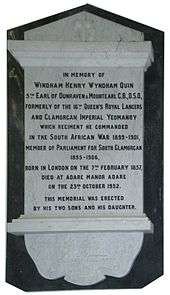Colonel Windham Henry Wyndham-Quin, 5th Earl of Dunraven and Mount-Earl CB, DSO (7 February 1857 – 23 October 1952) was an Irish Peer, British Army officer and a Conservative Member of Parliament for South Glamorganshire 1895–1906.