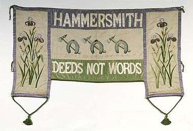 The founders decided to form a women-only organisation, which would campaign for social reforms, largely in conjunction with the Independent Labour Party. They would also campaign for an extension of women's suffrage, believing that this was central to sexual equality. To illustrate their more militant stance, they adopted the slogan "Deeds, not words".[1] By 1913, the WSPU appointed the fiercely militant feminist Nora Dacre Fox (later known as Norah Elam) as General Secretary. Dacre Fox operated as a highly effective propagandist delivering rousing speeches at the WSPU weekly meetings and writing many of Christabel Pankhurst's speeches.[2]