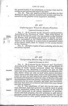 - ↑ see facsimile at An Act to Grant to the Women of Wyoming Territory the Right of Suffrage and to Hold Office. Library of Congress. December 10, 1869. Retrieved 2007-12-09.