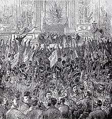 As the ideas of Marx and Engels took on flesh, particularly in central Europe, socialists sought to unite in an international organisation. In 1889, on the centennial of the French Revolution of 1789, the Second International was founded, with 384 delegates from 20 countries representing about 300 labour and socialist organisations.[95] It was termed the "Socialist International" and Engels was elected honorary president at the third congress in 1893. Anarchists were ejected and not allowed in, mainly due to pressure from Marxists.[96] It has been argued that, at some point, the Second International turned "into a battleground over the issue of libertarian versus authoritarian socialism. Not only did they effectively present themselves as champions of minority rights; they also provoked the German Marxists into demonstrating a dictatorial intolerance which was a factor in preventing the British labor movement from following the Marxist direction indicated by such leaders as H. M. Hyndman".[97]