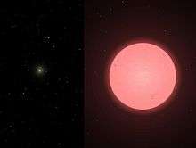 The angular diameter if La Superba has been measured at 13.81 mas.[12] It is expected to be pulsating but this has not been seen in the measurements. At 320pc, this corresponds to a radius of 2.2 astronomical units (473 R☉). If it were placed at the position of the Sun, the star's surface would extend beyond the orbit of Mars.