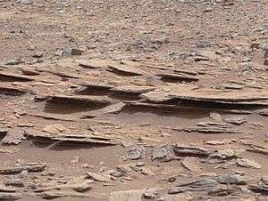 Yellowknife Bay is a geologic formation in Gale Crater on the planet Mars. NASA's Mars Science Laboratory Rover, named Curiosity, arrived at the low lying depression on December 17, 2012, 125 sols, or martian days, into its 668 sol planned mission on the planet. Primary mission goals of the Mars Science Laboratory were to assess the potential habitability of the planet and whether or not the Martian environment is, or has ever been, capable of supporting life.[1] The site was chosen after much study of the region by previous missions. The Mars Reconnaissance Orbiter observed morphological features created by the presence of liquid water, suggesting the presence of an ancient lake which could have sustained microbial life. The geologic depression takes its name from the city Yellowknife, capital of the Canadian Northwest Territories,[2] in honor of the 4 billion year old rock in the region surrounding the city, which matches the approximate age of the uncovered rock in Gale Crater.[3]