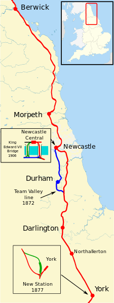 Although the Great North of England Railway had authority for a railway from York to Newcastle, by 1841 it had spent all of the £1,330,000 of capital that had been authorised to build the line to Darlington and could not start work on the extension to Newcastle. At the time Parliament was considering the route of a railway between England and Scotland and favouring a railway via the west coast. Railway financier George Hudson chaired a meeting of representatives of north-eastern railways who wished such a railway to be built via the east coast,[39] and Robert Stephenson was engaged to select a route between Darlington and Newcastle using the existing railways as much as possible. Stephenson's proposed route differed from the GNER route slightly in the southern section before joining the Durham Junction at Rainton and using the Pontop & South Shields from Washington to Brockley Whins, where a new curve onto the Brandling Junction would allow direct access to Gateshead. This required the construction of 25 1⁄2 miles (41.0 km) of new line, 9 miles (14 km) shorter than the GNER route, but trains would need to travel 7 1⁄2 miles (12.1 km) further. However, this bypassed the S&DR, even though the railway ran parallel to the S&DR for 5 miles (8.0 km). Joseph Pease argued that it should run over its lines as this would add only 1 1⁄2 miles (2.4 km) to the route.[40] The bill was presented to Parliament in 1842, it was opposed by the S&DR and the Dean and Chapter of Durham, who were asking for £12,000 for land with the N&DJR offering only £2,400; eventually a jury valued this land at £3,500. The Newcastle and Darlington Junction Railway Act received Royal Assent on 18 June 1842, but a second Act the following year was necessary to secure the deviations from the GNER route in the south recommended by Stephenson.[38][41]