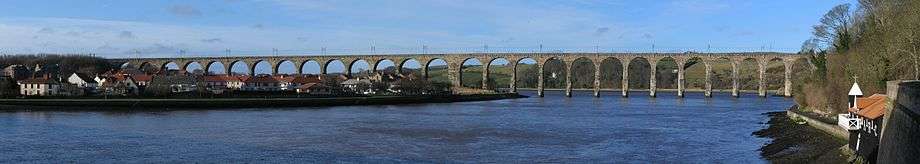 The contract for the Tweed crossing was not let as quickly as expected, and the foundation stone was only laid on 15 May 1847. Robert Stephenson designed the structure. It has 28 arches of 61 ft 6in span, with the rails 120 feet above the river. The viaduct is on a curve. The arches have brick soffits and the pier faces are of masonry.[56]