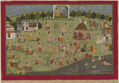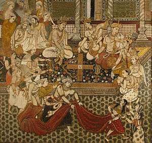 ![]() Yudhishthira on the throne with Draupadi, surrounded by the other Pandavas | |