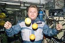 Onufriyenko is photographed in the Zvezda Module with Apples and oranges floating freely in front of him.