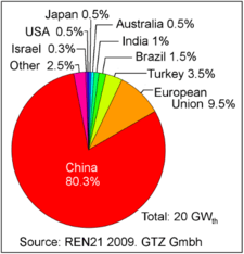 China is the first country for solar water heating capacity in the world, with 290 GWth in operation at the end of 2014, accounting for about 70% of the total world capacity. In terms of capacity per unit of population, China comes 7th in the world with 213 kWth per 1,000 people. Most of the installed capacity (92%) was evacuated tube water heaters.[6]