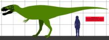 It is one of the largest known carnivorous theropods, and the holotype has been estimated to have been 10–12 m (33–39 ft) in length and up to 6 short tons (5.4 t) in weight. The holotype dentary is slightly smaller than that of most specimens of Tyrannosaurus rex and slightly bigger than most of Tarbosaurus bataar,[1] but significantly smaller than the corresponding bones of the largest Tyrannosaurus specimen ("Sue").[3]