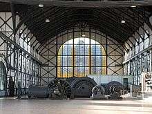 Due to deadline pressure, the central engine house was built in iron framework construction with infilling of red brickwork, planned and executed by the Gutehoffnungshütte. The Art Nouveau styled main entrance was designed by the Berlin architect Bruno Möhring, it shows a lead glazing of blue, green and-glass. Counterpart of the main entrance is the big control board of polished marble in brass mounting, with a brass clock hanging from above.