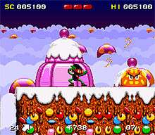 Zool was intended as a rival to Sega's Sonic the Hedgehog. George Allen came with the idea of Zool as he was criticized on his previous game Switchblade II for having a lack of enemies. In development, Zool could cast spells to get him out of trouble by collecting potions. For example, Zool could escape from pits with high jump spells and cast a shadow spell to make a clone of him that follows his actions (thus doubling the fire power). In the final version, the spells were replaced with collectible powerups. The very early name for the project was Pootz.[1] The soundtrack by Patrick Phelan overlaps with the Lotus 3 soundtrack and inspired several modern electro/techno remixes. The game was heavily hyped upon its initial release, including being bundled with the newly launched Amiga 1200, although not the AGA version with enhanced graphics which followed later. In 2000, the Amiga version of Zool was re-released as part of The Best of Gremlin compilation.