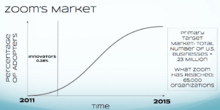 Zoom was founded in 2011 by engineers from the development teams of Cisco and its collaboration business unit, WebEx.[2] The founder of Zoom, Eric S. Yuan, graduated from the Stanford University Executive Program and was previously Vice President of engineering at Cisco where he was responsible for collaboration software development. David Berman, the current standing President of Zoom,[3] previously held the same position atop of Worldwide Sales and Services at WebEx Communications.[4] The official launch of Zoom was in January 2013 and, as of May 2013, it had reached 1 million participants.[5] During the first year of its release, Zoom has established partnerships with B2B collaboration software providers. Its partnership with Redbooth (which, at the time, was known as Teambox) played a role in adding a video component to its platform.[6] Shortly after this partnership, Zoom created a program named "Works with Zoom", which established partnerships with multiple hardware and software vendors such as Logitech, Vaddio,[7] and InFocus.[8][9][10] Towards the end of the year, Zoom managed to have its software integrated into InterviewStream, a company that provides remote video interviewing capacity to employers.[11]