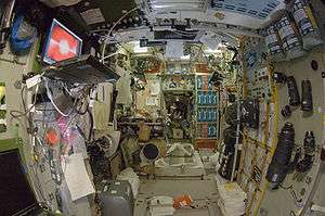 Zvezda can support up to six crew[6] including separate sleeping quarters for two cosmonauts at a time.[6] It also has a NASA-provided Treadmill with Vibration Isolation System and a bicycle for exercise, a toilet and other hygiene facilities and a galley with a refrigerator and freezer. The module contains the primary Russian computers for guidance and navigation.